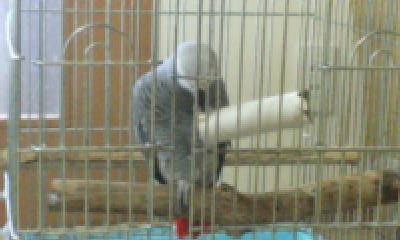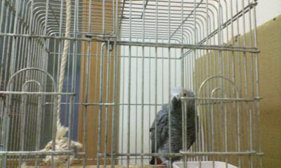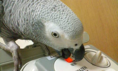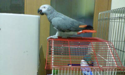 セキセイたちのカゴに乗って空気清浄機にイタズラをするぽん。